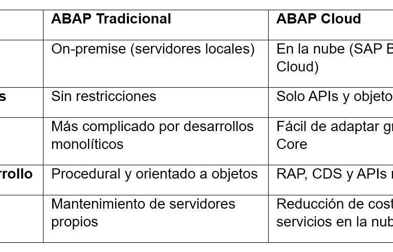 Si trabajas en el ecosistema SAP o estás explorando sus posibilidades, seguramente has escuchado términos como ABAP Tradicional y ABAP Cloud. Ambos tienen como núcleo el lenguaje ABAP (Advanced Business Application Programming), pero hay diferencias importantes entre ellos que vale la pena entender. En este artículo, te explicaré de forma sencilla las diferencias clave y cuándo deberías usar uno u otro. ¡Vamos a ello!