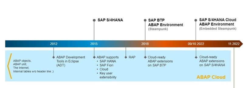 SAP TechEd Announcement: En noviembre de 2022, SAP hizo un anuncio en SAP TechEd, consolidando la disponibilidad y el soporte de ABAP Cloud en el entorno de SAP S/4HANA Cloud.